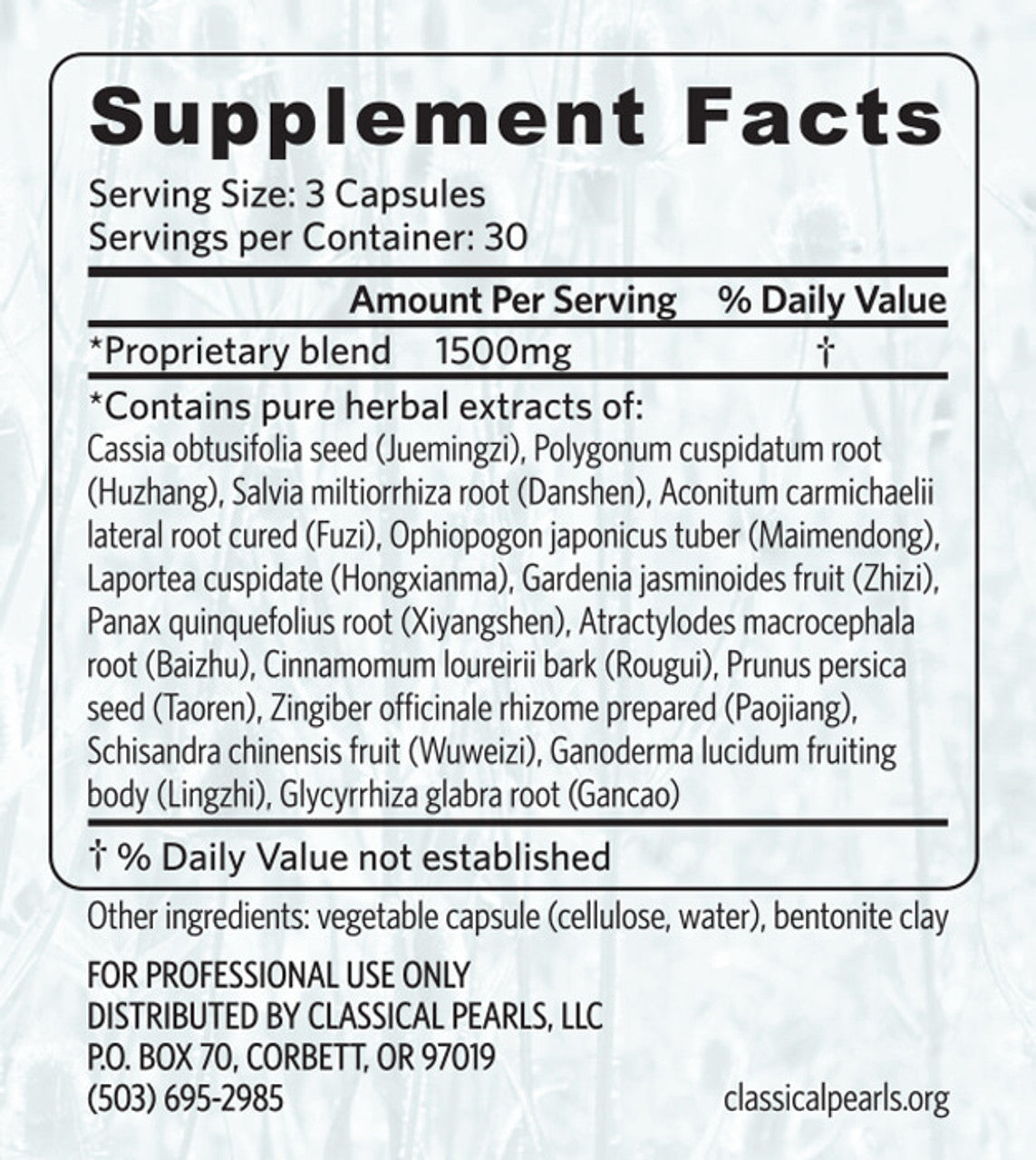 Cassia obtusifolia seed (Juemingzi), Polygonum cuspidatum root (Huzhang), Salvia miltiorrhiza root (Danshen), Aconitum carmichaelii lateral root cured (Fuzi), Ophiopogon japonicus tuber (Maimendong), Laportea cuspidate (Hongxianma), Gardenia jasminoides fruit (Zhizi), Panax quinquefolius root (Xiyangshen), Atractylodes macrocephala root (Baizhu), Cinnamomum loureirii bark (Rougui), Prunus persica seed (Taoren), Zingiber officinale rhizome prepared (Paojiang), Schisandra chinensis fruit (Wuweizi), Ganoderma lucidum fruiting body (Lingzhi), Glycyrrhiza glabra root (Gancao)